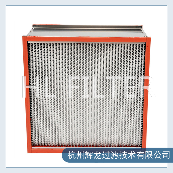 高效耐高溫過濾器使用隔板式設計,波紋形隔板可以精確地保持褶層間距,在最小阻力下,最大限度地利用濾料。過濾器濾材兩面180褶翻折形成鍥形褶層,濾料折彎時有兩道壓痕,使其在隔板的尾端開成鍥形盒式褶層,鍥形盒式褶層可以防止濾料破損。